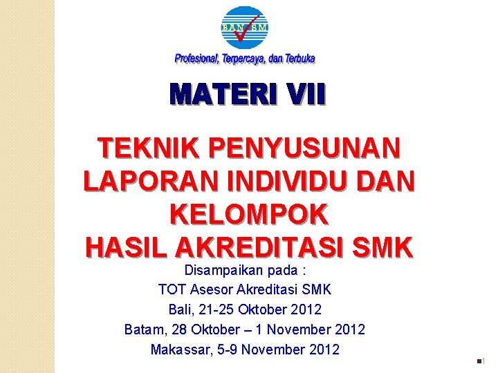 Standar pendidik dan tenaga kependidikan,; Permen no.48 th.2008, no.69 th.2009. Ban sm mengeluarkan perangkat akreditasi khusus untuk smk dengan mempertimbangkan. Standar pendidik dan tenaga kependidikan (38 sampai dengan 56). Standar pembiayaan terdiri dari 26 butir dalam akreditasi sekolah landasan hukum : Instrumen akreditasi smk disusun berdasarkan . 117 s.d 129 (13 butir). Ke delapan jenis standar tersebut wajib untuk di isi dan di sesuaikan dengan apa yang ada dan terjadi pada sekolah yang akan di akreditasi sehingga tim visitasi . Standar pembiayaan · standar pengelolaan · standar sarana prasarana . Biaya investasi satuan pendidikan sebagaimana dimaksud di atas meliputi biaya penyediaan sarana dan prasarana, pengembangan sumberdaya manusia, dan modal kerja . Standar pendidik dan tenaga kependidikan. Standar pembiayaan, prasarana, sarana, dan sistem informasi . Standar sarana dan prasarana (57 sampai dengan 84).